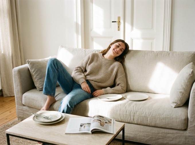 Nằm ườn xem TV, lướt điện thoại hoặc sa đà vào các món tráng miệng nhiều đường ngọt sau ăn dễ dẫn đến dư thừa năng lượng, tích tụ thành mỡ bụng.