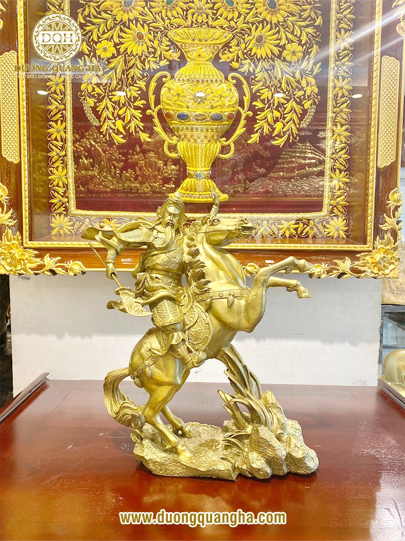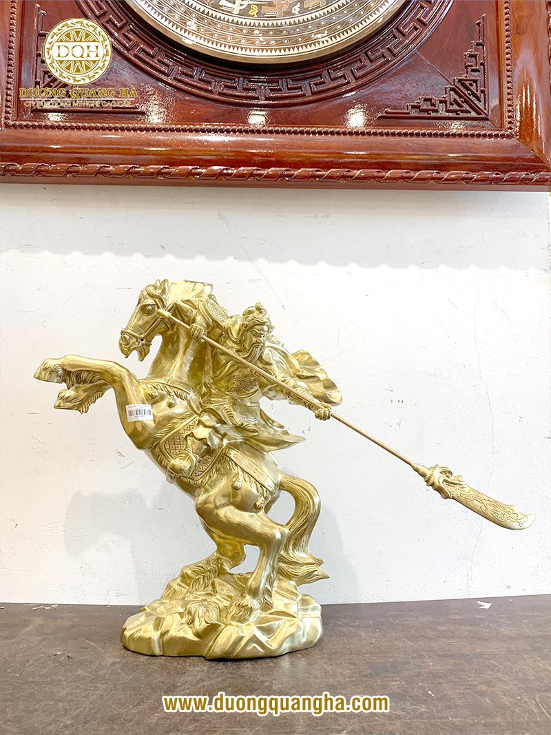 Hình ảnh Quan Vân Trường cưỡi ngựa Xích Thố, tay cầm Thanh Long Đao, biểu hiện sự hùng dũng và oai phong, với ý chí chiến đấu mãnh liệt, ngoan cường không ngại khó khăn. Việc trưng bày tượng Quan Công cưỡi Xích Thố trong nhà sẽ giúp trấn yêu, trừ tà, gìn giữ sự bình an cho gia đình. Đồng thời, nó còn mang ý nghĩa nhắc nhở mọi người trong gia đình hãy noi gương Quan Công vượt qua mọi khó khăn.